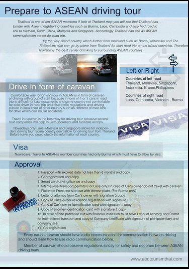 การขับรถเที่ยวกำลังได้รับความนิยมเป็นอย่างมากในปัจจุบันนี้ และประเทศไทยก็เป็นอีกหนึ่งประเทศที่เข้าสู่ประชาคมเศรษฐกิจอาเซียน (AEC) หลายคนจึงคิดที่จะไปเที่ยวประเทศต่างๆในกลุ่มอาเซียน ด้วยระยะทางจากประเทศไทยที่ไม่ไกลมากนัก การขับรถไปเที่ยวเองนับว่าเป็นทางเลือกที่น่าสนใจ แล้วเราควรเตรียมตัวอย่างไรบ้างเพื่อขับรถเที่ยวประเทศต่างๆในกลุ่มอาเซียน