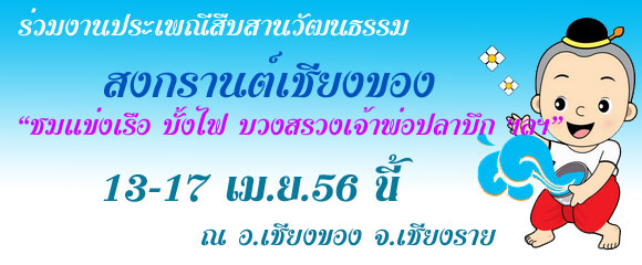 อำเภอเชียงของขอเชิญเที่ยวงานประเพณีสืบสานวัฒนธรรมสงกรานต์เชียงของ ประจำปี 2556 ระหว่างวันที่ 13-17 เมษายน 2556 ชมการประกวดธิดาชาติพันธุ์ ขบวนแห่นางสงกรานต์ บั้งไฟ แข่งเรือ ร่วมสรงน้ำพระ บวงสรวงเจ้าพ่อปลาบึก อื่นๆอีกมากมายด้านตำรวจเน้นย้ำเมาแล้วขับเจอคุกส่งฟ้องศาลหรือดื่มบนรถคุก 6 เดือนปรับหมื่นบาท