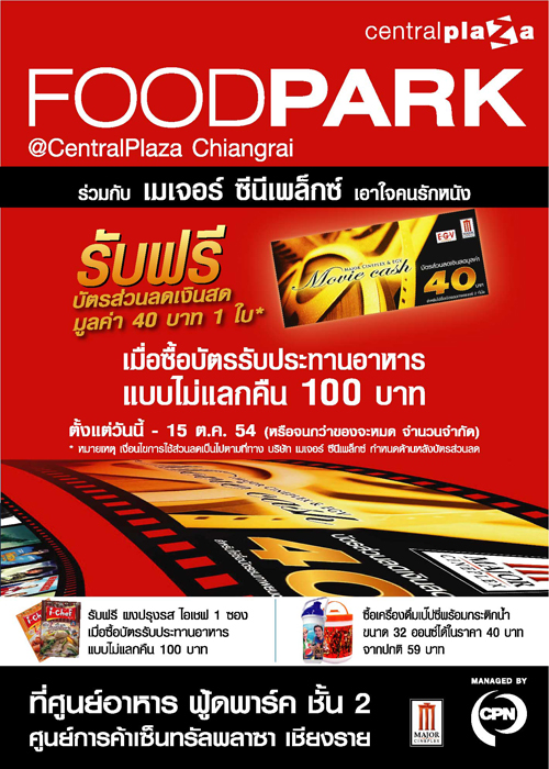 ศูนย์การค้าเซ็นทรัลพลา เชียงราย ร่วมกับโรงภาพยนตร์เมเจอร์ ซีนีเพล็กซ์ เอาใจคนรักหนัง จัดโปรโมชั่นสุดคุ้ม เพียงซื้อบัตรรับประทานอาหารที่ฟู๊ดพาร์ค ชั้น 2 แบบไม่แลกคืน มูลค่า 100 บาท รับฟรี!! บัตรส่วนลดเงินสดมูลค่า 40 บาท 1 ใบทันที พร้อมรับฟรีผงปรุงรส ไอเชฟ 1 ซอง และยังมีสิทธิ์แลกซื้อเครื่องดื่มเป๊ปซี่พร้อมกระติกน้ำ ขนาด 32 ออนซ์ได้ในราคาเพียง 40 บาท จากปกติราคา 59 บาท