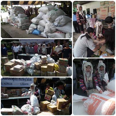 รายงานข่าวแจ้งอีกว่าด้านชาวไทยภูเขาเผ่าลาหู่นำโดยนายมานิด กุ่ยแก้ว ได้นำสิ่งของบริจาคไปส่งให้กับ อบต.แม่กรณ์ อ.เมือง โดยเป็นข้าวสารจำนวน 1,497 ชุด เงินสดจำนวน 135,440 บาท เพื่อนำไปมอบต่อให้ผู้ประสบภัย โดยนายมานิดชาวลาหู่ใน จ.เชียงราย และเชียงใหม่ ได้รวบรวมข้าวสารและเงินจำนวนดังกล่าวไปส่งให้ อบต.แม่กรณ์ เพื่อส่งผ่านทางสมาคมท้องถิ่นไทยแห่งประเทศไทย สาขาภาคเหนือ เพื่อนำไปส่งต่อไป |