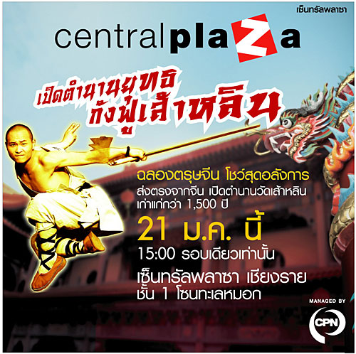 ศูนย์การค้าเซ็นทรัลพลาซา เชียงราย จัดงาน “CentralPlaza Chinese New Year 2012” เพื่อเป็นการเฉลิมฉลองต้อนรับเทศกาลตรุษจีน ซึ่งเป็นเทศกาลขึ้นปีใหม่ของคนไทยเชื้อสายจีนในจังหวัดเชียงราย และจังหวัดใกล้เคียง ตื่นตาตื่นใจกับการแสดงสุดอลังการ “ เส้าหลินเปิดตำนานยุทธแดนมังกร” จากประเทศจีน ครั้งแรกในจังหวัดเชียงราย โดยท่านธานินทร์ สุภาแสน ผู้ว่าราชการจังหวัดเชียงราย ให้เกียรติร่วมเป็นประธานเปิดงานดังกล่าว จัดขึ้นระหว่างวันที่ 19-24 มกราคม 2555 ณ โซนทะเลหมอก ศูนย์การค้าเซ็นทรัลพลาซา เชียงราย