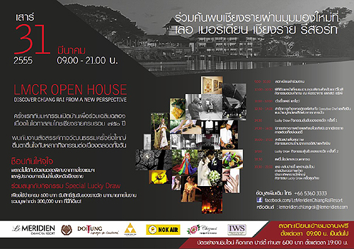 เนื่องในโอกาสเฉลิมฉลองสมโภชจังหวัดเชียงรายครบ ๗๕๐ ปี โรงแรมเลอ เมอริเดียน เชียงราย รีสอร์ท ได้มีกำหนดจัดงาน ‘LE MERIDIEN CHIANG RAI RESORT OPEN HOUSE - DISCOVER CHIANG RAI FROM A NEW PERSPECTIVE’ โดยมีเป้าหมายเพื่อส่งเสริมภาพลักษณ์และประชาสัมพันธ์จังหวัดเชียงราย ในฐานะศูนย์กลางศิลปะและวัฒนธรรม และจุดหมายการเดินทางพักผ่อนท่องเที่ยวที่สร้างสรรค์และเป็นแรงบันดาลใจ ณ โรงแรมเลอ เมอริเดียน เชียงราย รีสอร์ท ในวันที่ 31 มีนาคม 2555 เวลา 9.00 น เป็นต้นไป