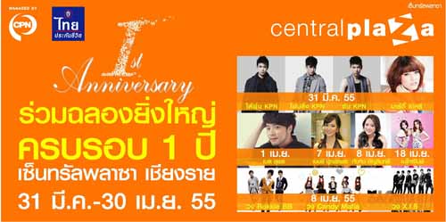 ศูนย์การค้าเซ็นทรัลพลาซา เชียงราย จัดงานฉลองครบรอบ 1 ปีสุดอลังการ CentralPlaza Chiangrai "1st Anniversary" Celebration โดยภายในงานได้รับเกียรติจากท่าน ธานินทร์ สุภาแสน ผู้ว่าราชการจังหวัดเชียงราย ร่วมเป็นประธานเปิดงาน พบกิจกรรมมากมาย อาทิ พิธีทำบุญเจริญพระพุทธมนต์ ครบรอบ 1 ปี, การแสดงจากวงเชียงรายยูธออร์เคสตร้า และมินิคอนเสิร์ตจากเหล่าศิลปินชื่อดัง ระหว่างวันที่ 30 มีนาคม - 1 เมษายน 2555 ณ ชั้น 1 โซนทะเลหมอก ศูนย์การค้าเซ็นทรัลพลาซา เชียงราย