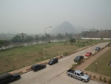 ผู้สื่อข่าวรายงานจาก จ.เชียงราย ว่าวันนี้ (19 มี.ค.) สภาพหมอกควันและฝุ่นละอองทั่วทั้งจังหวัดยังกลับมาวิกฤตเช่นเดิม โดยยังไม่มีฝนตกลงมาเพื่อชะล้างอากาศตามที่มีการคาดการณ์กันก่อนหน้านี้ โดยกรมควบคุมมลพิษได้ตรวจวัดคุณภาพอากาศจากบริเวณหน้าด่านพรมแดนไทย-พม่า หน้าสำนักงานสาธารณสุข อ.แม่สาย พบมีฝุ่นละอองที่มีขนาดเล็กกว่า 10 ไมครอนในอากาศมากถึง 431.6 ไมโครกรัมต่อลูกบาศก์เมตร ใกล้เคียงกับจุดวิกฤตที่สุดเมื่อวันที่ 11 มี.ค.55 ที่ผ่านมา ซึ่งอยู่ที่ 437.6 ไมโครกรัมต่อลูกบาศก์เมตร ซึ่งถือว่าอยู่ในเกณฑ์อันตราย ทำให้สภาพอากาศทั่วไปขมุกขมัวและทัศนวิสัยในการมองเห็นย่ำแย่อย่างมาก ขณะที่การวัดค่าอากาศจากบริเวณด้านหน้าสำนักงานทรัพยากรธรรมชาติและสิ่งแวดล้อม จ.เชียงราย พบอยู่ที่ 267.7 ไมโครกรัมต่อลูกบาศก์เมตร