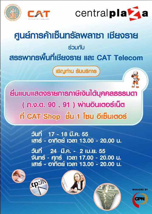 ศูนย์การค้าเซ็นทรัลพลาซา เชียงราย ร่วมกับ กรมสรรพากรพื้นที่จังหวัดเชียงราย และCAT Telecom ขอเชิญชวน ทุกท่านร่วมรับบริการ
