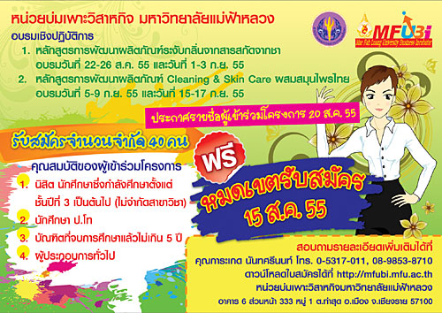 หน่วยบ่มเพาะวิสาหกิจมหาวิทยาลัยแม่ฟ้าหลวง จัดอบรมการพัฒนาผลิตภัณฑ์ระงับกลิ่นและผลิตภัณฑ์แชมพู สบู่และครีมทาผิว ไม่เสียค่าใช้จ่าย รับจำนวนจำกัด สนใจคลิ๊ก link ด้านล่าง