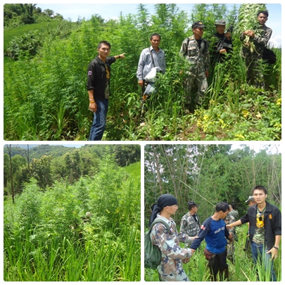 เมื่อวันที่ 13 ก.ย. 2555 ศูนย์ปฏิบัติการพลังแผ่นดินเอาชนะยาเสพติดอำเภอแม่สรวย (ศพส.อ. แม่สรวย) โดยการนำของ นายพิภัช ประจันเขตต์ นายอำเภอแม่สรวย พร้อมด้วยเจ้าหน้าที่ฝ่ายปกครองอำเภอแม่สรวย ได้สนธิกำลังร่วมกับ จนท.ตำรวจ สภ.แม่สรวย , จนท.อุทยานแห่งชาติลำน้ำกก , จนท.หน่วยป้องกันรักษาป่าที่ ชร.16 , จนท.ตชด.327, จนท.ตำรวจ กก.4 บก.ปทส. และ จนท.สายตรวจสำนักบริหารพื้นที่อนุรักษ์ที่ 15 ได้ร่วมกันบุกขึ้นหมู่บ้านแสนเจริญ ต.วาวี ทำการตัดทำลายพื้นที่ปลูกพืชเสพติด ซึ่งเป็นไร่ข้าว โดยมีการนำยาเสพติด (กัญชา) ปลูกแซมไว้ในไร่ข้าว จำนวนทั้งสิ้น 2 แปลง แปลงที่ 1 มีเนื้อที่ 4 ไร่ แปลงที่ 2 เนื้อที่ 5 ไร่ 98 ตารางวา ทั้งหมดอยู่บริเวณทางด้านทิศเหนือของบ้านแสนเจริญ หมู่ที่ 10 ต.วาวี อ.แม่สรวย จ.เชียงราย โดยสามารถจับกุมผู้ต้องหาได้ 1 ราย ทราบชื่อ นายสมนึก เชอมือ อายุ 45 ปี อยู่บ้านเลขที่ 69 หมู่ที่ 10 ต.วาวี อ.แม่สรวย จ.เชียงราย ขณะกำลังถอนหญ้าอยู่ในไร่ เจ้าหน้าที่จึงแสดงตัวและเข้าทำการจับกุม นายสมนึก ให้การรับสารภาพว่า กัญชาแปลงที่ 1 ดังกล่าวเป็นของตนเอง ซึ่งได้ลักลอบทำการปลูกเพื่อจำหน่าย ส่วนแปลงที่ 2 จนท.กำลังสืบสวนติดตามผู้เป็นเจ้าของเพื่อมาดำเนินคดี ต่อไป |