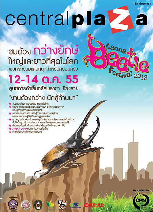 ศูนย์การค้าเซ็นทรัลพลาซา เชียงราย ร่วมกับ จังหวัดเชียงราย, องค์การบริหารส่วนจังหวัดเชียงราย,มหาวิทยาลัยราชภัฏเชียงราย, สมาคมท่องเที่ยวจังหวัดเชียงราย, สโมสรฟุตบอลเชียงรายยูไนเต็ด จัดกิจกรรม “ด้วงกว่างนักสู้ล้านนา Lanna Beetle Festival 2012” พบกับการโชว์สุดยอดสายพันธ์กว่างยักษ์ ใหญ่และยาวที่สุดในโลก กว่าง เฮอร์คิวลิต พร้อมกว่างสายพันธ์หายากต่างๆ 5 สายพันธุ์ จากทุกมุมโลก พบกิจกรรมแสนสนุกสำหรับครอบครัว ระหว่างวันที่ 12-14 ต.ค. 55 ณ ชั้น 1 โซนทะเลหมอก ศูนย์การค้าเซ็นทรัลพลาซา เชียงราย