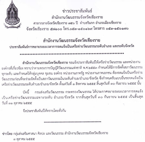 สำนักงานวัฒนธรรมจังหวัดเชียงราย ขยายระยะเวลาการจดแจ้ง เป็นเครือข่ายวัฒนธรรม ระดับอำเภอ และจังหวัด จากสิ้นสุด วันที่ 30 กันยายน 2555 เป็นสิ้นสุด วันที่ 31 ตุลาคม 2555