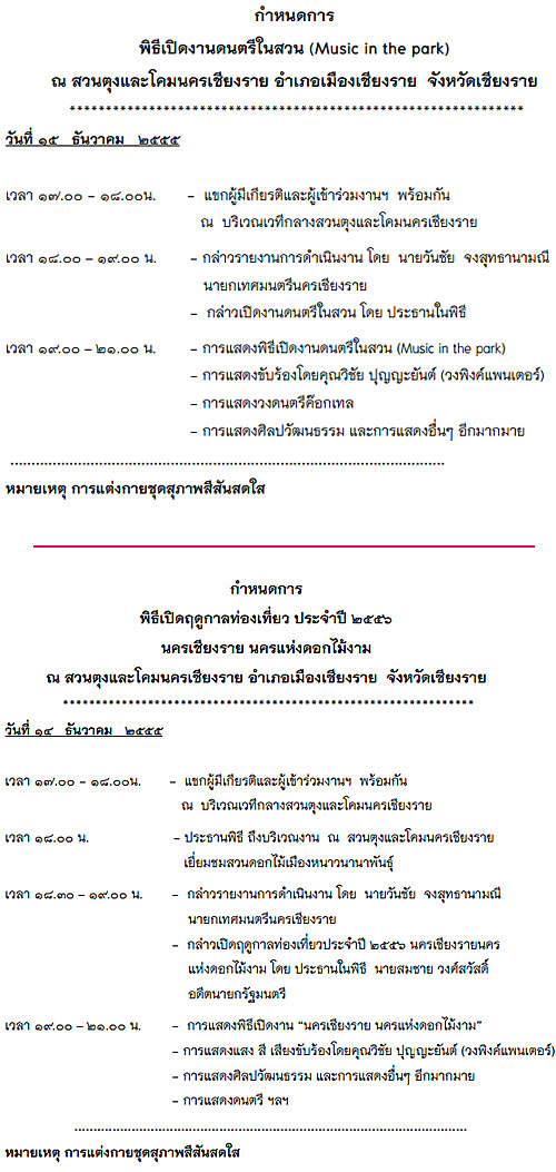 ในวันศุกร์ที่ 14 ธันวาคม 2555 เวลา 18.00 เป็นต้นไป และวันเสาร์ที่ 15 ธันวาคม 2555เวลา 18.00 เป็นต้นไป ณ สวนตุงและโคม นครเชียงราย