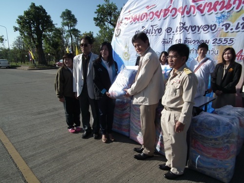 จากนั้นทางโครงการฯ ยังได้นำผ้าห่มกันหนาวอีกจำนวน 2,000 ผืน ไปมอบแก่ชาวบ้านที่สนามโรงเรียนบ้านเมืองกาญจน์ ต.ริมโขง อ.เชียงของ โดยมีฝ่ายปกครอง อ.เชียงของเป็นตัวแทนรับมอบ ก่อนนำไปแจกจ่ายชาวบ้านประมาณ 2 พันครัวเรือนใน 9 หมู่บ้านต่อไป