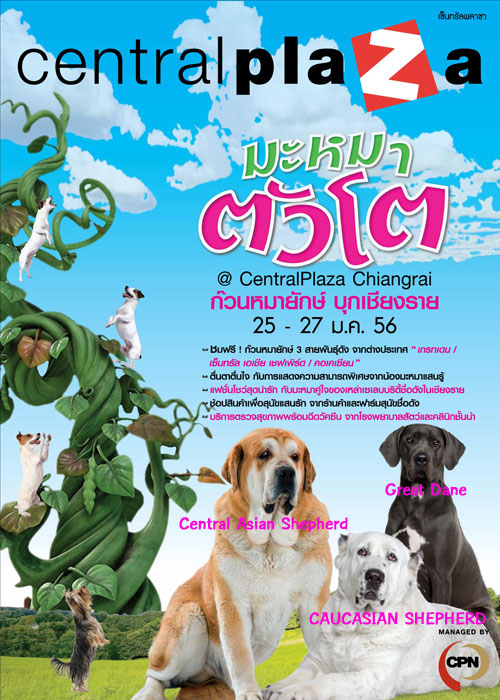 ศูนย์การค้าเซ็นทรัลพลาซา เชียงราย ขอเชิญพบกับสุดยอดงานโชว์สุนัขครั้งยิ่งใหญ่แห่งปี ในงาน “มะหมา ตัวโต” ตื่นตาตื่นใจกับการแสดงความสามารถพิเศษจากสุนัขแสนรู้ พร้อมสุนัขสายพันธุ์ใหญ่ยักษ์ที่สุด 3 สายพันธุ์ ได้แก่ Great Dane(สุนัขพันธุ์เกรทเดน), Central Asian Shepherd (สุนัขพันธุ์เซ็นทรัลเอเชีย เชฟเพิร์ด ) และ Caucasian Shepherd (สุนัขพันธุ์คอร์เคเชี่ยน เชฟเพิร์ด) พร้อมชมแฟชั่นโชว์น้องหมาแสนรักของเหล่าเซเลบริตี้ชื่อดัง และเลือกซื้อน้องหมาพันธุ์ที่คุณชื่นชอบจากฟาร์มสุนัขชื่อดัง พร้อมสินค้าเพื่อสัตว์เลี้ยงแสนรักมากมาย อาทิ ผลิตภัณฑ์อาหาร ของขบเคี้ยวสำหรับสุนัข แชมพู โลชั่น สเปรย์ดูแลบำรุงขน เครื่องแต่งกาย และของเล่น ระหว่างวันที่ 25 - 27 มกราคม 2556 ณ ชั้น 1 โซนกังหันลมไม้ไผ่ และโซนทะเลหมอก ศูนย์การค้าเซ็นทรัลพลาซา เชียงราย