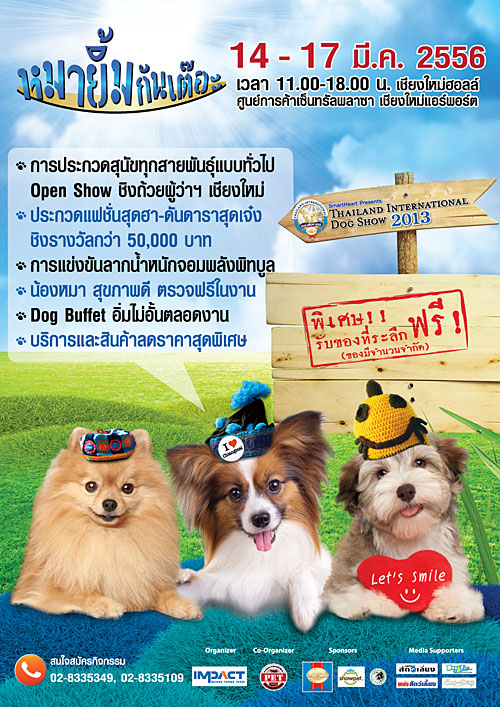 คนรักน้องหมาเมืองเหนือเตรียมตัวไปกับขบวนน้องหมายิ้มกันเต๊อะที่ขนกันมาโชว์ในงาน SmartHeart presents Thailand International Dog Show - หมายิ้มกันเต๊อะ ณ เมืองเชียงใหม่ งานสำหรับคนรักสุนัขที่จะเพลิดเพลินไปกับร้านค้าและผลิตภัณฑ์เกี่ยวกับสุนัขมากมายที่ขนกันมาลดกระหน่ำให้พี่น้องชาวเหนือได้ช็อปกันอย่างจุใจ อีกทั้งกิจกรรมดีๆ ที่มีให้ยิ้มกันทุกวัน อาทิ การประกวดสุนัขทุกสายพันธุ์แบบทั่วไป (Open Show) ชิงถ้วยเกียรติยศและของรางวัล , แข่งขันความสามารถของน้องหมาซุปตาร์ Dog Star Search EP.2 (ชิงเงินรางวัล), การประกวดแฟชั่นโชว์ Funny Dog Contest (Mix & Match) หมายิ้มสไตล์ ระหว่างเจ้าของกับสุนัข (ชิงเงินรางวัล), ฟรีกับอิ่มไม่อั้นกับ Dog Buffet, การแข่งขันลากน้ำหนักสุนัขพันธุ์พิทบูลชิงแชมป์ภาคเหนือ ครั้งที่ 2 และที่ขาดไม่ได้การตรวจสุขภาพน้องหมาฟรีกับโรงพยาบาลสัตว์ สัตวแพทย์ 4 ทั้งหมดนี้จะมีขึ้นในวันที่ 14-17 มีนาคม 2556 ณ เชียงใหม่ฮอลล์ ศูนย์การค้าเซ็นทรัลพลาซา เชียงใหม่แอร์พอร์ต สอบถามข้อมูลเพิ่มเติมติดต่อ 02-833-5313