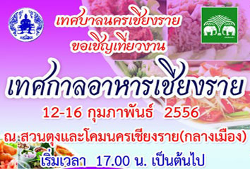 เทศบาลนครเชียงราย จัดงานเทศกาลอาหารเชียงราย “Chiang Rai Foods Festival 2013” ระหว่างวันที่ 12 – 16 กุมภาพันธ์ 2556 อย่างยิ่งใหญ่ท่ามกลางบรรยากาศสายลมและดอกไม้ ณ บริเวณสวนตุงและโคมนครเชียงราย อ.เมือง จ.เชียงราย