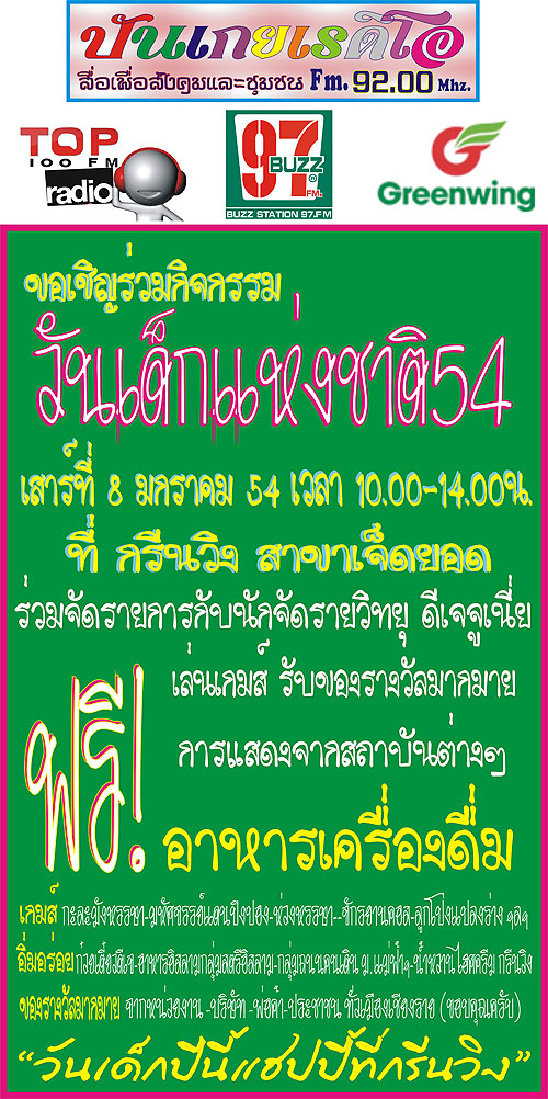 ขอเชิญร่วมกิจกรรม วันเด็กแห่งชาติ 54 กับปันเกยเรดิโอ วันเสาร์ ที่ 8 มกราคม 54 ณ กรีนวิง สาขาเจ็ดยอด