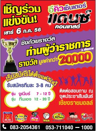 ขอเชิญชวนร่วมการประกวด EQ center Dance contest ชิงถ้วยรางวัลท่านผู้ว่าราชการจังหวัดเชียงราย และเงินรางวัลรวมกว่า 20,000 บาท ในวันที่ 6 กรกฎาคม 2556 นี้ เวลา 09.00 – 15.00 น. ณ ชั้น 2 CR MALL หรือ ทวียนต์สำนักงานใหญ่ สี่แยกประตูสลี