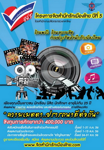 สำหรับนักเรียน นิสิต นักศึกษา ที่สนใจร่วมกิจกรรมในโครงการ “จิตสำนึกรักเมืองไทย ปี ๕” ในหัวข้อ “ความเมตตา...ปรารถนาดีต่อกัน” ไม่ว่าจะเป็น การประกวดผลงานภาพถ่าย สปอตโทรทัศน์ การสร้างสรรค์บทเพลง ชิงทุนกำรศึกษามูลค่ารวมกว่า ๔๐๐,๐๐๐ บาท พร้อมประกำศนียบัตรเชิดชูเกียรติจาก พล.อ.ทนงศักดิ์ อภิรักษ์โยธิน ปลัดกระทรวงกลำโหม สำมำรถติดตำมความเคลื่อน ไหว ดาวน์โหลดหรือส่งใบสมัคร และรายละเอียดกิจกรรม ได้ที่เว็บไซต์ www.จิตสำนึกรักเมืองไทย.com กำหนดรับสมัครตั้งแต่ ๑ - ๓๐ ก.ค. ๕๖ และกำหนดรับผลงาน ๑ - ๑๕ ส.ค. นี้