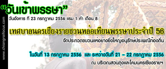 นายวันชัย จงสุทธานามณี นายกเทศมนตรีนครเชียงราย เปิดเผยว่า ในทุกปีที่ตรงกับวันแรม 1 ค่ำ เดือน 8 ถือว่าเป็นวันสำคัญทางศาสนาวันหนึ่งคือ วันเข้าพรรษา ชาวพุทธศาสนิกชนส่วนใหญ่นิยมถวายเทียนพรรษา อธิษฐานบำเพ็ญบุญตลอด 3 เดือน เพื่อเป็นกุศลบารมีแห่งตน ซึ่งในปีนี้วันเข้าพรรษาตรงกับวันอังคารที่ 23 กรกฎาคม 2556 ดังนั้นเทศบาลนครเชียงรายจึงร่วมกับหน่วยงานราชการ หน่วยงานเอกชน สถาบันการศึกษา และพี่น้องประชาชนในชุมชนต่างๆ จัดงานประเพณีแห่เทียนพรรษา ประจำปี 2556 ขึ้น ในวันที่ 13 กรกฎาคม 2556 และระหว่างวันที่ 21 – 22 กรกฎาคม 2556 ณ บริเวณสวนตุงและโคมนครเชียงรายฯ โดยมีกำหนดการดังนี้
