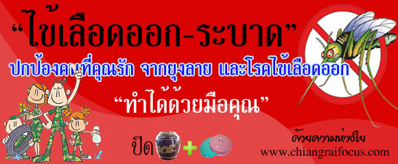 สาธารณสุขเชียงราย รวมพลัง อสม. กว่า 2 หมื่นคน ขจัดภัยร้าย กำจัดยุงลาย พิชิตไข้เลือดออก พร้อมกันทั่วประเทศ ระหว่างวันที่ 10 – 16 กรกฎาคม 2556 เผยตั้งแต่ 1 มกราคม – 8 กรกฎาคม 2556 เชียงรายพบผู้ป่วยไข้เลือดออก 3,645 คน เสียชีวิต 4 คน มากสุดของประเทศ เฉพาะสัปดาห์ที่ผ่านมาพบผู้ป่วย 499 คน