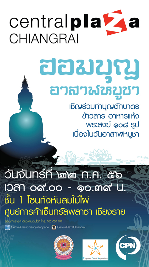 ศูนย์การค้าเซ็นทรัลพลาซา เชียงราย ขอเชิญชวนพุทธสากนิกชนทุกท่านร่วมทำบุญตักบาตรข้าวสารอาหารแห้ง พระสงฆ์ จำนวน 108 รูป พร้อมรับฟังปฐกถาธรรม เพื่อสร้างความเป็นสิริมงคล เนื่องในวันอาสาฬหบูชา ซึ่งเป็นวันสำคัญที่พระพุทธเจ้าทรงแสดงพระธรรมที่ตรัสรู้เป็นครั้งแรก จึงถือได้ว่าวันนี้เป็นวันเริ่มต้นประกาศพระพุทธศาสนาแก่ชาวโล และเพื่อเป็นการทำนุบำรุงพระพุทธศาสนาให้คงอยู่สืบไป ในงาน “ฮอมบุญ..อาสาฬหบูชา” วันจันทร์ ที่ 22 กรกฎาคม 2556 เวลา 09.09 น. เป็นต้นไป ณ ชั้น 1 โซนกันหันลมไม้ไผ่ ศูนย์การค้าเซ็นทรัลพลาซา เชียงราย |