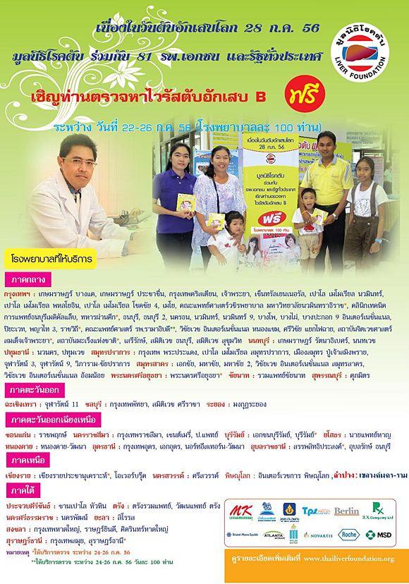 เนื่องในวันตับอักเสบโลก 28 กรกฎาคม 2556 มูลนิธิโรคตับ ร่วมกับโรงพยาบาลเอกชน และรัฐจาก 29 จังหวัดทั่วประเทศ รวม 81 แห่ง ขอเชิญท่านที่เกิดก่อนปี2535 (ประเทศไทยให้วัคซีนป้องกันโรคตับอักเสบบีในเด็กแรกเกิดทั่วประเทศตั้งแต่ปี 2535) และยังไม่เคยตรวจมาก่อน ร่วมตรวจหาไวรัสตับอักเสบ B ฟรี ในโครงการ “เรารักตับ” ครั้งที่11 ระหว่างวันที่ 22 - 26 กรกฎาคม 2556 โดยจะให้บริการตรวจโรงพยาบาลละ 100 ท่าน(ยกเว้นคณะแพทยศาสตร์ รพ.รามาธิบดี ตรวจวันละ 100 ท่าน 3 วัน คือระหว่างวันที่ 24-26 ก.ค.56) รวมตรวจ 5 วันสามารถรองรับการตรวจทั้งสิ้น 8,300 ท่าน
