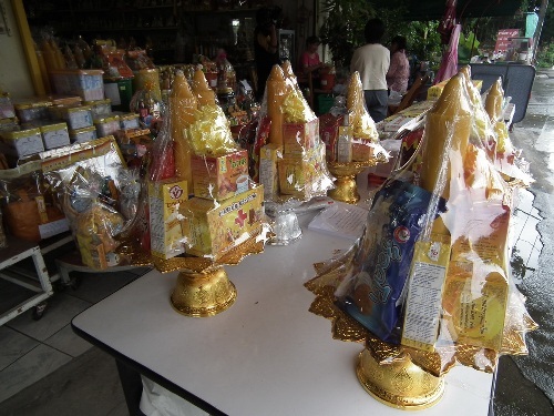 นางกาบแก้ว รอดขันเมือง เจ้าของร้านจำหน่ายเครื่องสังฆทาน “ทวีทรัพย์วัตถุมงคล” ชุมชนศรีเกิด ถนนบรรพปราการ อ.เมือง กล่าวว่า ตลาดเครื่องสังฆทานตั้งแต่ก่อนเทศกาลเข้าพรรษายังอยู่ในเกณฑ์ดี ไม่ได้ลดลงจากปีที่ผ่านมาเลย จนเครื่องสังฆทานทั้งที่สั่งจากบริษัท และจัดทำขึ้นเองหมดลง ทำให้ทางร้านต้องประกอบเครื่องสังฆทานขึ้นมาขายเพิ่ม