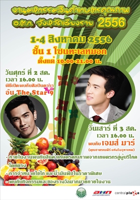 องค์การตลาดเพื่อการเกษตร จังหวัดเชียงราย ร่วมกับ ศูนย์การค้าเซ็นทรัลพลาซา เชียงราย ขอเชิญร่วมงาน มหกรรมการเกษตรคุณภาพ อ.ต.ก.จังหวัดเชียงราย พบสินค้าการเกษตรคุณภาพจากเกษตรกรผู้ผลิตสู่ผู้บริโภคโดยตรง อาทิ การจำหน่ายไข่ไก่ น้ำมันพืช สินค้าทางการเกษตร พร้อมกิจกรรมบันเทิงมากมาย พลาดไม่ได้กับมินิคอนเสิร์ตจาก “อ้น เดอะสตาร์ 9” (วันศุกร์ที่ 2 ส.ค.56 เวลา 16.00 น.เป็นต้นไป) และพบกับคุณชายยรณพีร์ จากวังจุฑาเทพ "เจมส์ มาร์" (วันเสาร์ที่ 3 ส.ค. 56 เวลา 16.00 น. เป็นต้นไป) ร่วมเลือกชมผลิตภัณฑ์คุณภาพ ระหว่างวันที่ 1-4 สิงหาคม 56 บริเวณ ชั้น 1 โซนทะเลหมอก ศูนย์การค้าเซ็นทรัลพลาซา เชียงราย