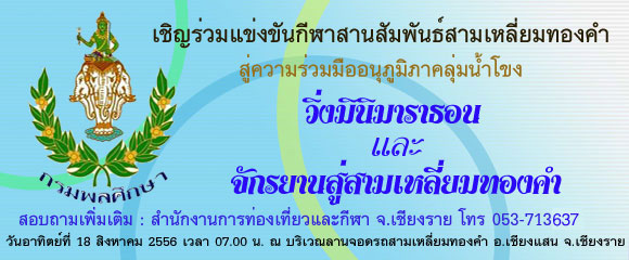 ด้วยกรมพลศึกษา ได้ให้เกียรติ จ.เชียงราย โดยสำนักงานการท่องเที่ยวและกีฬา จ.เชียงราย จัดโครงการ กีฬาสัมพันธ์สามเหลี่ยมทองคำสู่ความร่วมมืออนุภูมิภาคลุ่มน้ำโขงตอนบน ในวันที่ 18 ส.ค 56 เวลา 07.00 น. เป็นต้นไป ณ บริเวณสามเหลี่ยมทองคำ โดยจะมีประเทศแถบลุ่มน้ำโขงเข้าร่วมการแข่งขัน ประกอบด้วยลาว พม่า และไทย