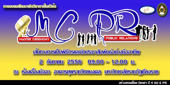 นักศึกษาโปรแกรมวิชานิเทศศาสตร์ สาขาการโฆษณาและการประชาสัมพันธ์ ชั้นปีที่ 4 จัดสัมมนาเชิงวิชาการในหัวข้อ “เส้นทางการเป็นพิธีกรและนักประชาสัมพันธ์อย่างมืออาชีพ” ในวันจันทร์ที่ 2 กันยายน 2556 เวลา 09.00-12.00 น. ณ ห้องประชุมเอื้องมัจฉา อาคารยุพราชวิทยมงคล มหาวิทยาลัยราชภัฏเชียงราย ในการสัมมนาครั้งนี้ได้เชิญวิทยากรที่มากด้วยความรู้ ความสามารถและประสบการณ์ทางด้านการเป็นพิธีกรและนักประชาสัมพันธ์มืออาชีพ คุณ สุดปฐพี เวียงสี Edutainment คนแรกของประเทศไทย