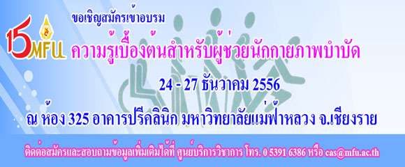 สำนักวิชาวิทยาศาสตร์สุขภาพ มหาวิทยาลัยแม่ฟ้าหลวง กำหนดจัดอบรมเชิงปฏิบัติการ เรื่อง ความรู้เบื้องต้นสำหรับผู้ช่วยนักกายภาพบำบัด ระหว่างวันที่ 24 – 27 ธันวาคม 2556 ณ ห้อง 325 อาคารปรีคลินิกมหาวิทยาลัยแม่ฟ้าหลวง จังหวัดเชียงราย เพื่อให้ผู้ช่วยนักกายภาพบำบัดมีความเข้าใจในหลักการปฏิบัติงาน การใช้หรือการเตรียมเครื่องมือในการรักษาทางกายภาพบำบัดมากยิ่งขึ้นมีการพัฒนาองค์ความรู้ทางกายภาพบำบัดและสามารถนำไปประยุกต์ใช้ในการทำงานได้