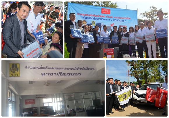 สายวันนี้(8 พ.ย.56) ที่โรงเรียนเชียงของวิทยาคม นายอนุสรณ์ แก้วกังวาน รองอธิบดีกรมป้องกันและบรรเทาสาธารณภัย นายประจญ ปรัชญ์สกุล รองผู้ว่าราชการจังหวัดเชียงราย นายไพรัช เผื่อนด้วง กรรมการกองทุนฮอนด้าเคียงข้างไทย นายทรงฤทธิ์ แก้วสุทธิ นายอำเภอเชียงของ ร่วมกันเป็นประธานปล่อยคาราวานรถยนต์บรรทุกผ้าห่มกันหนาว ตามโครงการ “กองทุนฮอนด้าเคียงข้างไทยและกระทรวงมหาดไทยช่วยเหลือผู้ประสบภัยหนาว ปี 2556-2557” ทั้งนี้ก่อนพิธีปล่อยรถยนต์คาราวานฯได้มีพิธีมอบเครื่องกำเนิดไฟฟ้าฮอนด้าจำนวน 2 เครื่อง และเครื่องสูบน้ำฮอนด้าพร้อมอุปกรณ์จำนวน 2 เครื่องรวมทั้งผ้าห่มกันหนาวจำนวน 8,500 ตัว ให้กับจังหวัดเชียงรายเพื่อนำไปช่วยเหลือผู้ประสบภัยหนาวและสาธารณะภัยอื่นๆ รวมทั้งมอบผ้าห่มกันหนาวให้กัประชาชนชาวเชียงของที่มารอรับจำนวนกว่า 300 คน