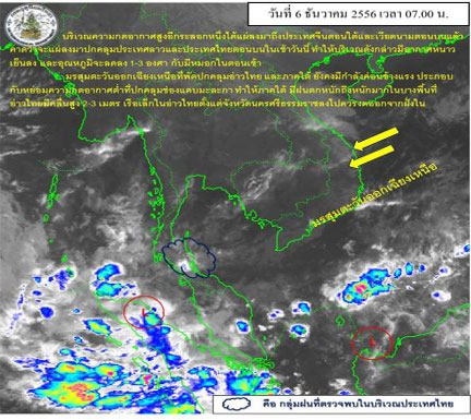 เมื่อเวลา 04.00 น. วันที่ 6 ธ.ค. กรมอุตุนิยมวิทยารายงานสภาพอากาศ ทั่วไปว่า บริเวณความกดอากาศสูงอีกระลอกหนึ่งได้แผ่ลงมาถึงประเทศจีนตอนใต้และเวียดนามตอนบนแล้ว คาดว่าจะแผ่ลงมาปกคลุมประเทศลาวและประเทศไทยตอนบน ในเช้าวันนี้ ทำให้บริเวณดังกล่าวมีอากาศหนาวเย็น และอุณหภูมิลดลง 1-3 องศา กับมีหมอกในตอนเช้า โดยจะเริ่มจากภาคตะวันออกเฉียงเหนือก่อน ส่วนภาคอื่นๆจะได้รับผลกระทบในระยะต่อไป ส่วนมรสุมตะวันออกเฉียงเหนือที่พัดปกคลุมอ่าวไทย และภาคใต้ ยังคงกำลังค่อนข้างแรง ประกอบกับหย่อมความกดอากาศต่ำที่ปกคลุมช่องแคบมะละกา ทำให้ภาคใต้บริเวณจังหวัดพัทลุง สงขลา ปัตตานี ยะลา นราธิวาส ตรัง และสตูล มีฝนตกหนักถึงหนักมากในบางพื้นที่ ขอให้ประชาชนบริเวณดังกล่าวระมัดระวังอันตรายและผลกระทบจากฝนตกหนัก ส่วนบริเวณอ่าวไทยมีคลื่นสูง 2-3 เมตร ขอให้ชาวเรือเดินเรือด้วยความระมัดระวังและเรือเล็กในอ่าวไทยตั้งแต่จังหวัดนครศรีธรรมราชลงไปควรงดออกจากฝั่งในระยะนี้ไว้ด้วย