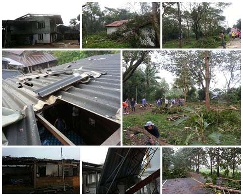 นายวิทยุ เปิดเผยว่า พายุหมุนดังกล่าวเกิดประมาณ 23 .30 น.ของเมื่อคืนที่ผ่านมา ก่อนเกิดเหตุพายุได้มีลมกรรโชกแรง จากนั้นเกิดพายุหมุนอย่างรุนแรงและมีพายุลูกเห็บตกลงมาใช้เวลาประมาณ 10นาทีพายุจึงสงบ แรงของพายุทำให้หลังคาบ้านของราษฏรหมู่ 2 ม.9 ม.3 และหมู่ 7 ได้รับความเสียหายประมาณ 10 กว่าหลังคาเรือน โดยเฉพาะหมู่ 3 บ้านซาวาได้รับความเสียหายหนักสุดแรงของพายุทำให้กระเบื้องมุงหลังคาของนายขจร ปินตาวนา ผู้ใหญ่บ้านหมู่ 9 เสียหายเกือบทั้งหลัง ถนนทางหลวงชนบทสายบุญเรืองใต้-บ้านแก่น หน้าวัดป่าอ้อ มีต้นไม้หักโค่นขวางถนนยาวกว่า 200 เมตร กีดขวางการจราจร เจ้าหน้าที่ต้องเร่งขนย้ายเพื่อให้รถสัญจรไปมาได้ นอกจากนี้อิทธิพลของพายุหมุนยังทำให้ต้นไม้ล้มทับสายไฟหลายจุดทำให้ไฟฟ้าดับนานหลายชั่วโมง ซึ่งทางเทศบาลได้ประสานไปยังการไฟฟ้าส่วนภูมิภาคสาขาเชียงของเข้าซ่อมแซมและใช้งานได้ตามปกติแล้ว รวมทั้งไร่ข้าวโพดบริเวณใกล้เคียงก็ได้รับความเสียหายด้วย เบื้องต้นเทศบาลได้สำรวจความเสียหายและกระเบื้องมุงหลังคาออกแจกจ่ายซ่อมแซมหลังคาบ้านให้กับชาวบ้านที่ได้รับความเดือนร้อนแล้ว ซึ่งการเกิดพายุหมุนครั้งนี้โชคดีไม่มีผู้ได้รับบาดเจ็บหรือได้รับอันตรายแต่อย่างได |