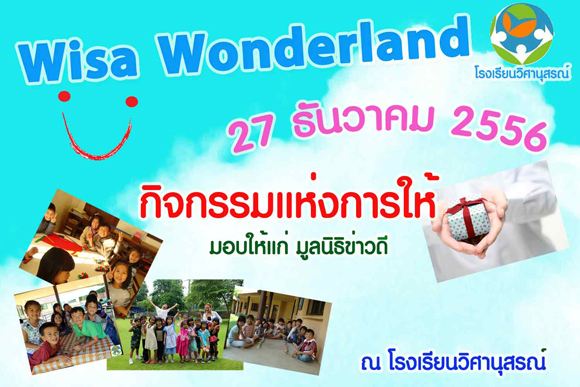 ในเทศกาลส่งท้ายปีเก่า ต้อนรับปีใหม่นี้ โรงเรียนวิศานุสรณ์ จะจัดกิจกรรมแห่งการให้ “Wisa Wonderland” โดยเชิญน้องๆ จากมูลนิธิข่าวดี มาร่วมกิจกรรมกับเด็กนักเรียนที่โรงเรียนในวัน ศุกร์ที่ 27 ธันวาคม 2556 เป็นการมอบความรัก ความสุข ในโอกาสดีๆ เช่นนี้