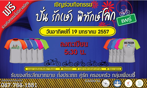 การท่องเที่ยวแห่งประเทศไทย (ททท.) สำนักงานแพร่ ขอเชิญชวนนักท่องเที่ยว และผู้สนใจร่วมกิจกรรม “ปั่น รัก(ษ์) พิทักษ์โลก” ในวันที่ ๑๙ มกราคม ๒๕๕๗ ณ บริเวณสถานที่ท่องเที่ยวต่างๆ ในอำเภอเมืองแพร่ จังหวัดแพร่
