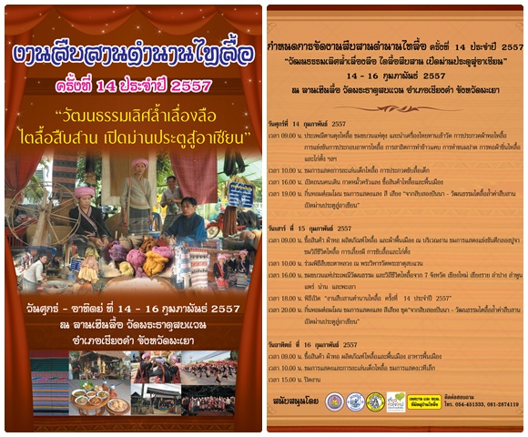ขอเชิญทุกท่านเที่ยวชมงานสืบสานตำนานไทลื้อ ครั้งที่ ๑๔ ประจำปี ๒๕๕๗ ณ วัดพระธาตุสบแวน อำเภอเชียงคำ จังหวัดพะเยา ระหว่างวันที่ ๑๔-๑๖ กุมภาพันธ์ ๒๕๕๗ ตั้งแต่เวลา ๐๙.๐๐ – ๒๒.๐๐ น.