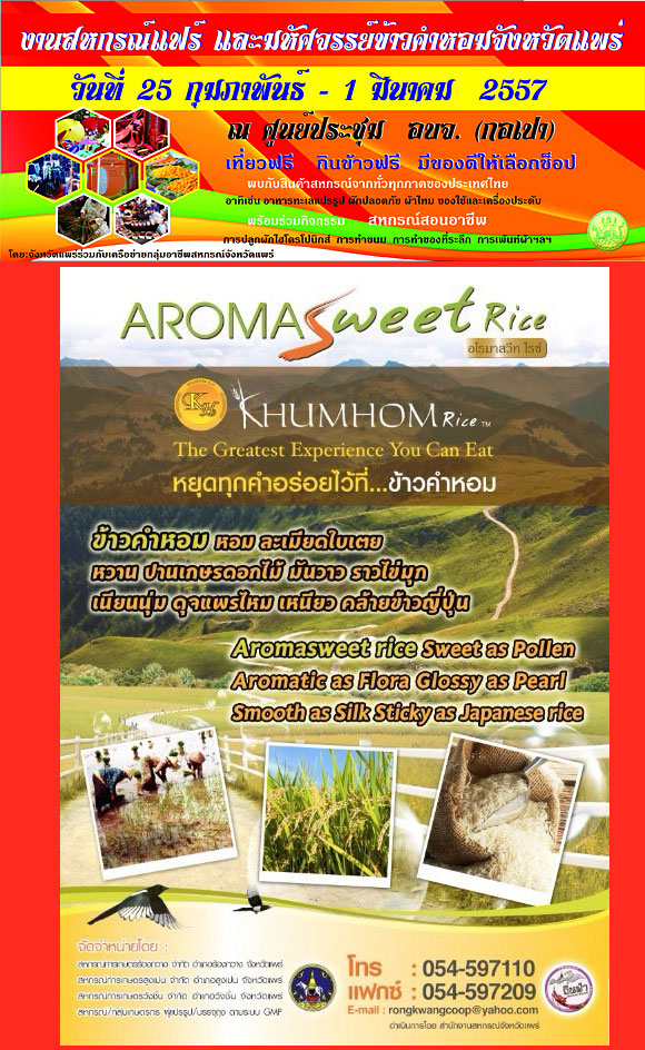 การท่องเที่ยวแห่งประเทศไทย (ททท.) สำนักงานแพร่ ขอเชิญชวนนักท่องเที่ยว และผู้สนใจเที่ยวงานสหกรณ์แฟร์ และมหัศจรรย์ข้าวคำหอมจังหวัดแพร่ ประจำปี ๒๕๕๗ ในระหว่างวันที่ ๒๕ กุมภาพันธ์ – ๑ มีนาคม ๒๕๕๗ ณ ศูนย์ประชุม อบจ. (กอเปา) ตำบลทุ่งโฮ้ง อำเภอเมือง จังหวัดแพร่
