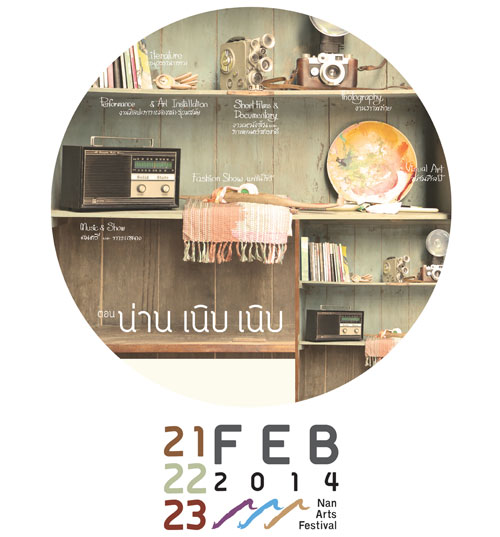 การท่องเที่ยวแห่งประเทศไทย (ททท.) สำนักงานแพร่ ขอเชิญชวนนักท่องเที่ยว และผู้สนใจเที่ยวชมงานเทศกาลศิลปะน่าน ตอน น่าน เนิบ เนิบ ในระหว่างวันที่ ๒๑ – ๒๓ กุมภาพันธ์ ๒๕๕๗ ณ พิพิธภัณฑสถานแห่งชาติ จังหวัดน่าน