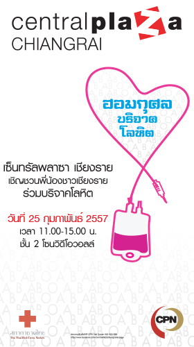 ศูนย์การค้าเซ็นทรัลพลาซา เชียงราย ร่วมกับ สภากาชาดไทย และ โรงพยาบาลเชียงรายประชานุเคราะห์ ขอเชิญชวนพี่น้องชาวเชียงราย จังหวัดใกล้เคียง และผู้มีจิตศรัทธา ร่วมกิจกรรมการกุศลบริจาคโลหิต ในงาน “ฮอมกุศล บริจาคโลหิต” เพื่อน้อมถวายเป็นพระราชกุศล และช่วยเหลือเพื่อนมนุษย์ ร่วมสร้างกุศลด้วยการให้ ในอังคาร ที่ 25 กุมภาพันธ์ 2557 ตั้งแต่เวลา 11.00 - 15.00 น. บริเวณ ชั้น 2 โซนวีดีโอวอลล์ ศูนย์การค้าเซ็นทรัลพลาซา เชียงราย