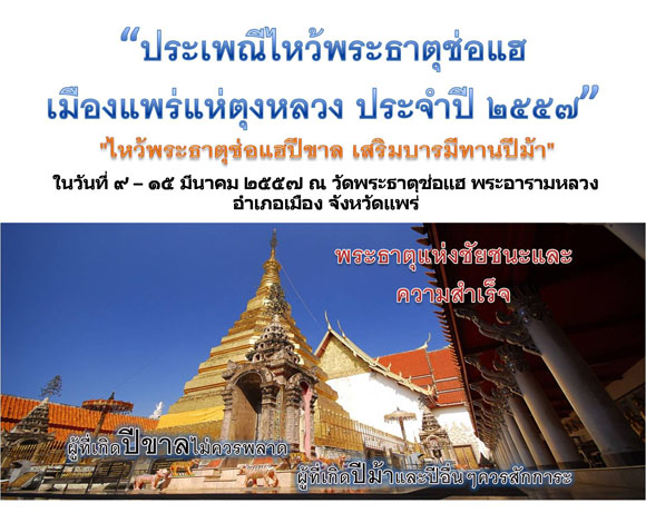วัดพระธาตุช่อแฮ พระอารามหลวง อาเภอเมือง จังหวัดแพร่ ได้กาหนดจัดงานประเพณีไหว้พระธาตุช่อแฮ เมืองแพร่แห่ตุงหลวง ประจาปี ๒๕๕๗ ขึ้นใน วันขึ้น ๙ ค่า ถึงขึ้น ๑๕ ค่า เดือน ๔ ใต้ (เดือน ๖ เหนือ) โดยในปีนี้จะตรงกับวันที่ ๙ – ๑๕ มีนาคม ๒๕๕๗