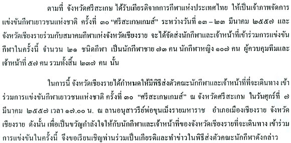 พิธีส่งตัวนักกีฬาและเจ้าหน้าที่เข้าร่วมการแข่งขันกีฬาเยาวชนแห่งชาติ ครั้งที่ 30 ศรีสะเกษเกมส์ ณ จังหวัดศรีสะเกษ ในวันศุกร์ที่ 7 มีนาคม 2557 เวลา 17.00 น. ณ ลานอนุสาวรีย์พ่อขุนเม็งรายมหาราช