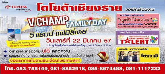 โตโยต้าเชียงรายได้มีการจัดกิจกรรมงาน V CHAMP FIMILY DAY ในวันเสาร์ที่ 22 มีนาคม 2557 เวลา 9.00 - 17.30 น. ณ โชว์รูมโตโยต้าเชียงราย (สำนักงานใหญ่)