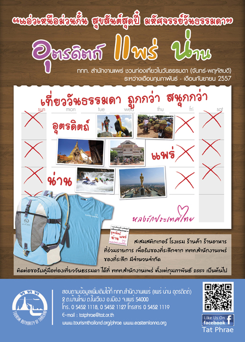 การท่องเที่ยวแห่งประเทศไทย (ททท.) สำนักงานแพร่ ขอเชิญชวนนักท่องเที่ยว และผู้สนใจ เดินทางท่องเที่ยวในวันธรรมดาตามโครงการ “แอ่วเหนือม่วนกั๋น สุขสันต์สุดปี๋ มหัศจรรย์วันธรรมดา” ในพื้นที่จังหวัดแพร่ น่าน และอุตรดิตถ์ ตั้งแต่บัดนี้จนถึงเดือนกันยายน ๒๕๕๗