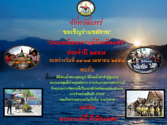 การท่องเที่ยวแห่งประเทศไทย (ททท.) สำนักงานแพร่ ขอเชิญชวนนักท่องเที่ยวที่กำลังอยู่ระหว่างการตัดสินใจเลือกสถานที่ท่องเที่ยวในช่วงสงกรานต์ ให้ลองเลือกมาเที่ยวที่เมืองแพร่ เพราะสงกรานต์ปีนี้ จังหวัดแพร่จัดกิจกรรมเต็มที่ตลอด ๑๓ วัน ระหว่างวันที่ ๕ – ๑๗ เมษายน ๒๕๕๖ เรียกได้ว่าเป็นสงกรานต์ที่นานที่สุดในภาคเหนือ
