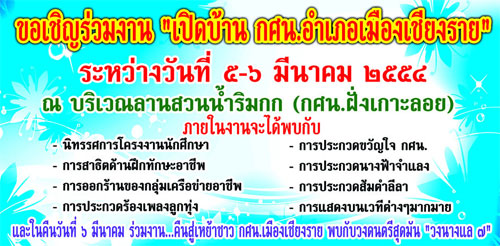 เชิญร่วมงาน เปิดบ้าน กศน.อำเภอเมืองเชียงราย ระหว่างวันที่ 5-6 มีนาคม 2554