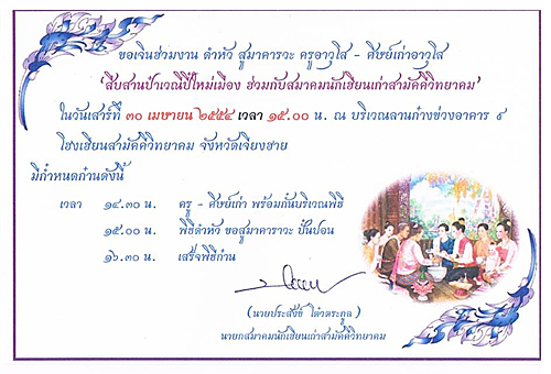 ขอเจินฮ่วมงาน ดำหัว สูมาคารวะ ครูอาวุโส – ศิษย์เก่าอาวุโส (สืบสานป๋าเวณีปี๋ใหม่เมือง ฮ่วมกับสมาคมนักเฮียนเก่าสามัคคีวิทยาคม) ในวันเสาร์ที่ 30 เมษายน 2554 เวลา 15.00 น. , ณ บริเวณลานก๋างข่วงอาคาร 9 โฮงเฮียนสามัคคีวิทยาคม จังหวัดเชียงราย
