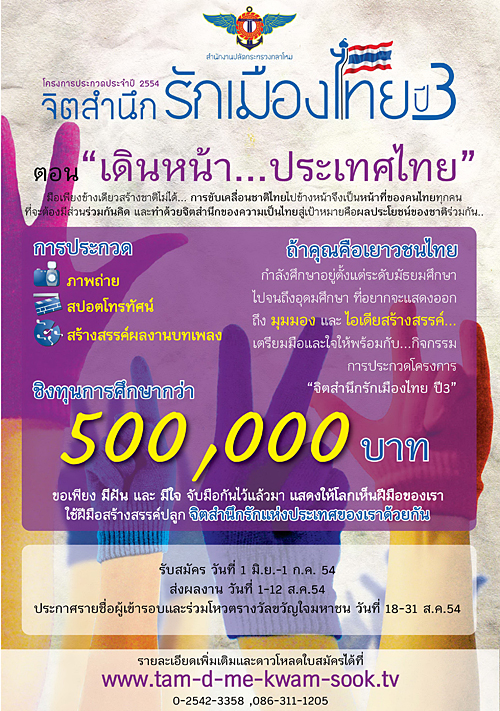 สำหรับนักเรียน นิสิต นักศึกษา ที่สนใจร่วมกิจกรรมในโครงการ “จิตสำนึกรักเมืองไทย ปี ๓” สามารถติดตามความเคลื่อนไหว ดาวน์โหลดใบสมัคร และรายละเอียดกิจกรรม ได้ที่เว็บไซต์ www.tam-d-me-kwam-sook.tv