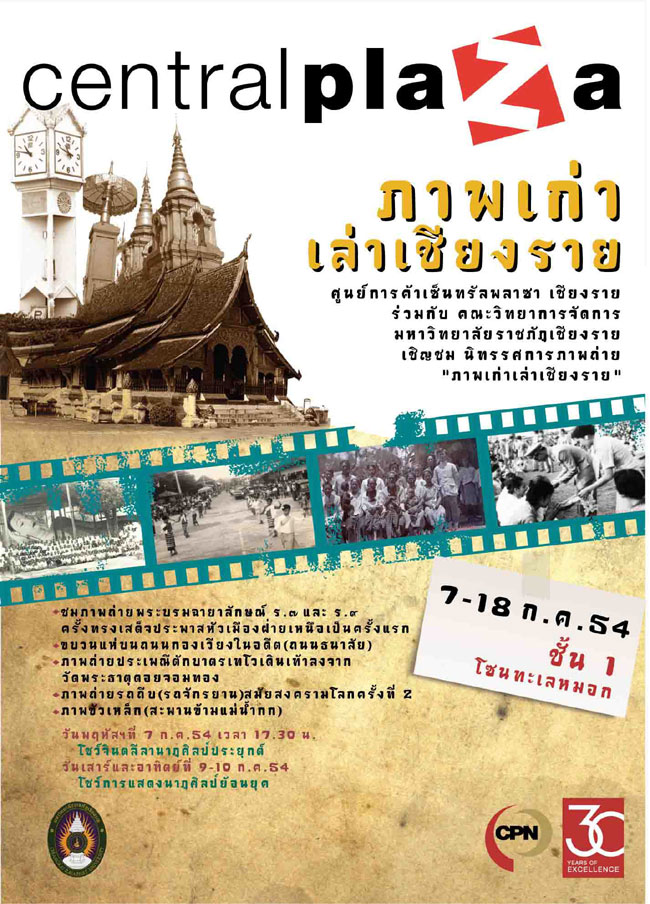 ศูนย์การค้าเซ็นทรัลพลาซา เชียงราย ร่วมกับ คณะวิทยาการจัดการ มหาวิทยาลัยราชภัฎเชียงราย ขอเชิญร่วมย้อนรำลึกถึงจังหวัดเชียงรายในสมัยโบราณ พร้อมตื่นตา ตื่นใจ กับ นิทรรศการ “ภาพเก่า เล่าเชียงราย” ซึ่งเป็นงานแสดงผลงานภาพเก่าที่สุดครั้งยิ่งใหญ่ที่หาดูได้ยาก ระหว่างวัน ที่ 7 -18 กรกฎาคม 2554 ณ ชั้น 1 โซนทะเลหมอก ศูนย์การค้าเซ็นทรัลพลาซา เชียงราย โดยได้รับเกียรติจากอาจารย์วรสฤษฎิ์ ปิงเมือง รองอธิการบดี ฝ่ายกิจการนักศึกษา มหาวิทยาลัยราชภัฏเชียงราย เป็นประธานเปิดงาน